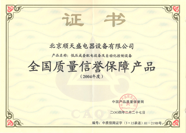 全國質(zhì)量信譽保障產(chǎn)品證書(2004)